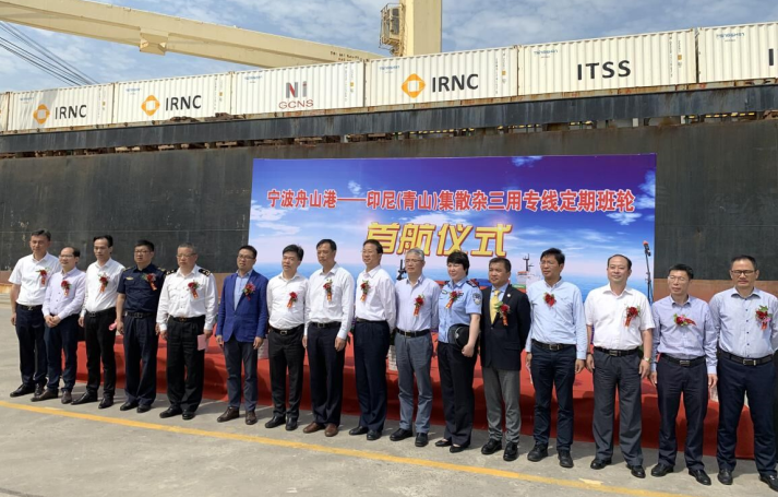 随着成人视频 海外园区项目的陆续投产,出口物资数量呈爆发式增长,过去的物流输送模式已无法满足当前新环境下的生产建设物资输送任务。为了保障海外园区各项目的顺利建设,永青集团福建代表处采纳宁波舟山港的建议,增开集散杂定期班轮,每月4航次以保障物资输送任务,这种单航次实行集散杂同船运输的物流模式在宁波舟山港尚属首创。5月22日,在宁波舟山港大榭信业码头举行了宁波舟山港–印尼(成人视频 )集散杂三用专线定期班轮首航仪式。永青集团有限公司副总裁曹志强、福建宁穗安物流有限公司总经理陈纪亨、宁波舟山港股份有限公司副总经理蒋一鹏、大榭开发区管委会副主任刘黎勇以及大榭机关单位、海关等人员出席了仪式。