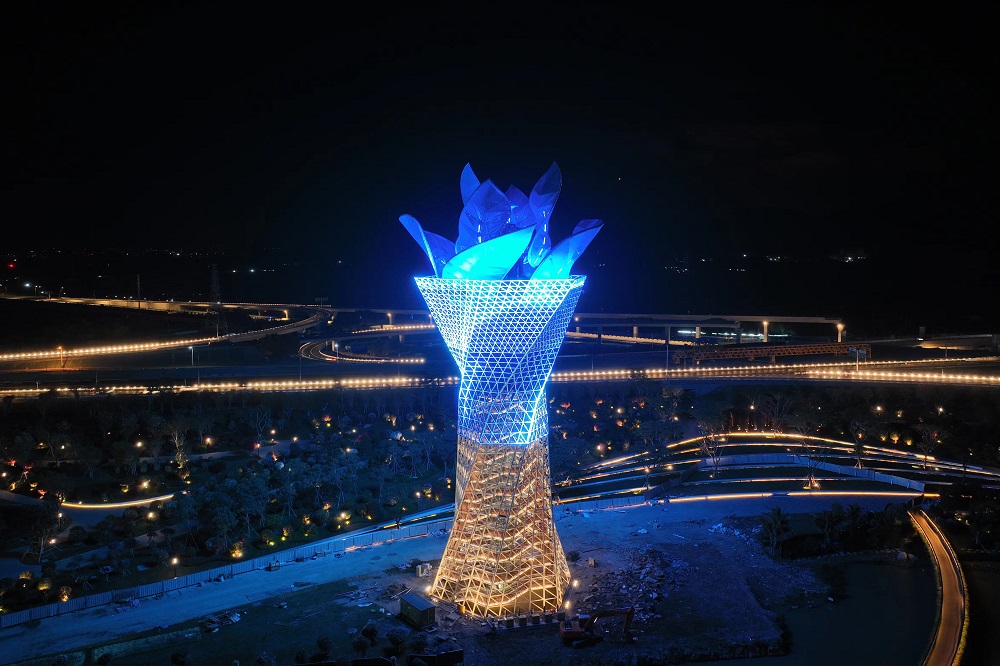 与此同时,三角梅采用动态旋转雕塑,造型似手捧花束,单个叶片采用异性空间桁架结构。与传统碳钢和铝合金材料相比,使用QD2001不锈钢可有效降低结构节点连接难度,提高全生命周期使用寿命且造价更低、安全性更强,非常适合异性曲面造型。