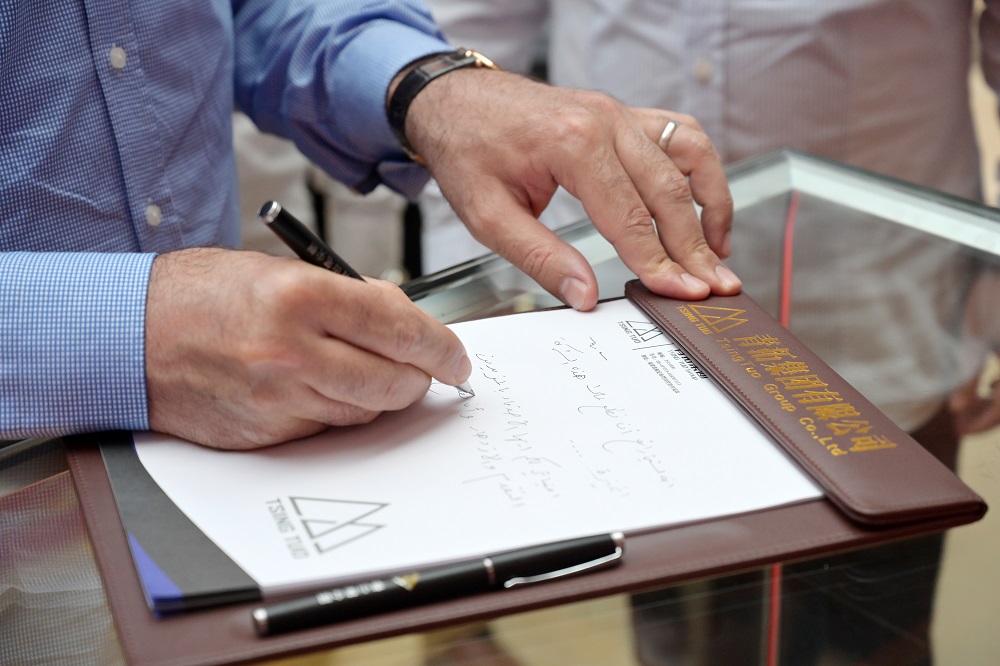 在青拓展厅,哈立德•巴塔尔•纳杰姆部长亲自体验青拓笔尖钢时写到:很高兴能到如此强大的公司参观,希望我们彼此之间的友谊能够越来越紧密,欢迎贵公司都到伊拉克投资建厂。