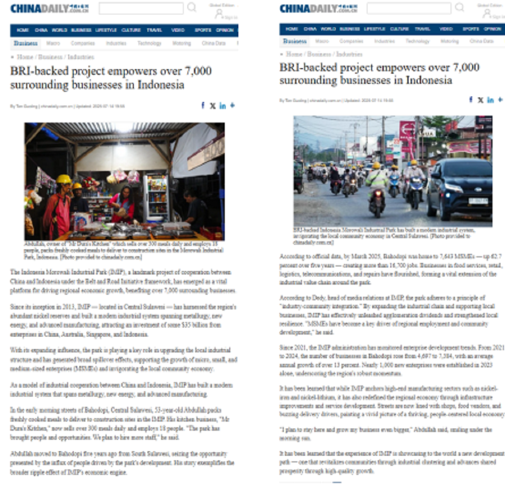 中国日报网电(记者 谭国玲)印尼莫罗瓦利园区(IMIP)作为中印尼共建“一带一路”的标志性项目,已发展成为带动区域经济增长的重要平台,辐射带动周边7000余家小微企业发展。