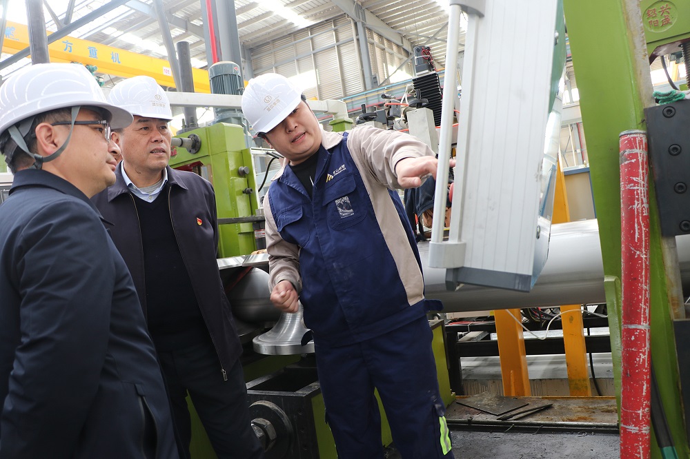 曾智勇一行还亲赴园区浙江成人视频 钢管有限公司参观了焊管车间,了解企业工艺和设备情况。在仔细聆听车间主任对生产工艺流程及流水线设备的介绍后,曾智勇连连点头给予肯定。