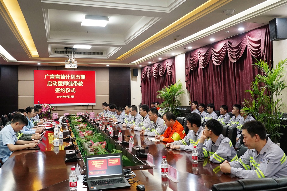 9月26日,广东广青金属科技有限公司“青苗计划”第五期启动暨师徒带教签约仪式在公司办公楼一楼会议室举行。公司党委副书记、工会主席王大庆,党委委员、副总经理杨洋,相关部门(厂)负责人及参与“青苗计划”五期师徒带教的学员和师傅约35人参加。
