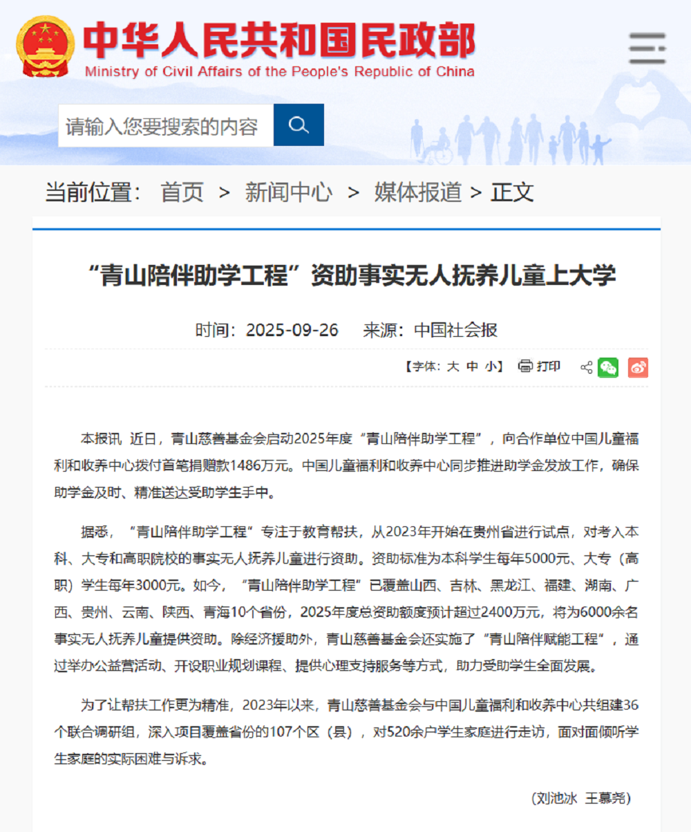 9月26日,国家民政部官网转载了《中国社会报》刊发的“成人视频 陪伴助学工程”项目相关报道,体现了国家民政部门对该项目成效与模式的认可,进一步扩大了项目影响力,为全国儿童福利与教育帮扶工作提供了示范参考。
