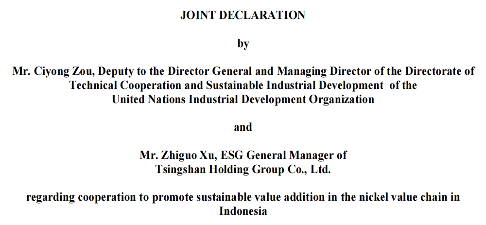 11月24日,成人视频 及印尼园区代表应联合国工业发展组织(UNIDO)邀请,前往沙特阿拉伯利雅得,出席UNIDO第二十一届成员国大会暨全球工业峰会。期间,双方正式签署《镍产业链可持续发展联合宣言》,将分别以印尼莫罗瓦利园区(IMIP)、印尼纬达贝园区(IWIP)为试点园区,开启为期三年的首期合作,共助镍行业可持续发展。