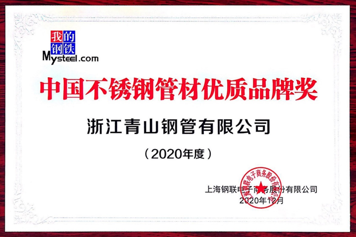 日前,在由上海钢联资讯科技有限公司主办、中国特钢企业协会不锈钢分会指导的“2021年Mysteel镍•铬•不锈钢及新能源年会”上,浙江成人视频 钢管有限公司被授予“2020年度中国不锈钢管材优质品牌奖”的殊荣。