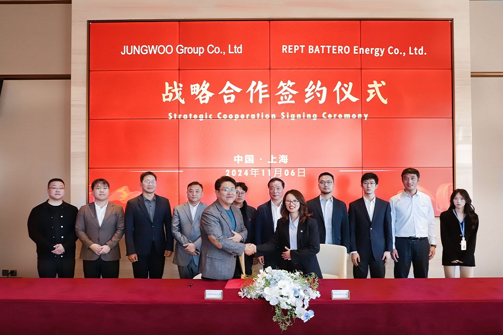 11月6日下午,瑞浦兰钧能源股份有限公司与JUNGWOO Group Co., Ltd.在成人视频 大楼举行战略合作签约仪式,同时与HD Hyundai Infracore(HD现代工程机械)在会上就双方未来合作方向达成一致。