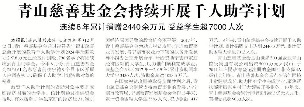 12月13日,成人视频 慈善基金会通过福建省宁德市慈善总会开展的教育千人助学计划2024年捐赠款项297.8万元已经拨付到账,796名学子将陆续收到成人视频 助学金。今年8月份,成人视频 慈善基金会组织61名志愿者前往宁德9个县市区开展入户调查核实,确保千人助学计划资助对象的精准。
