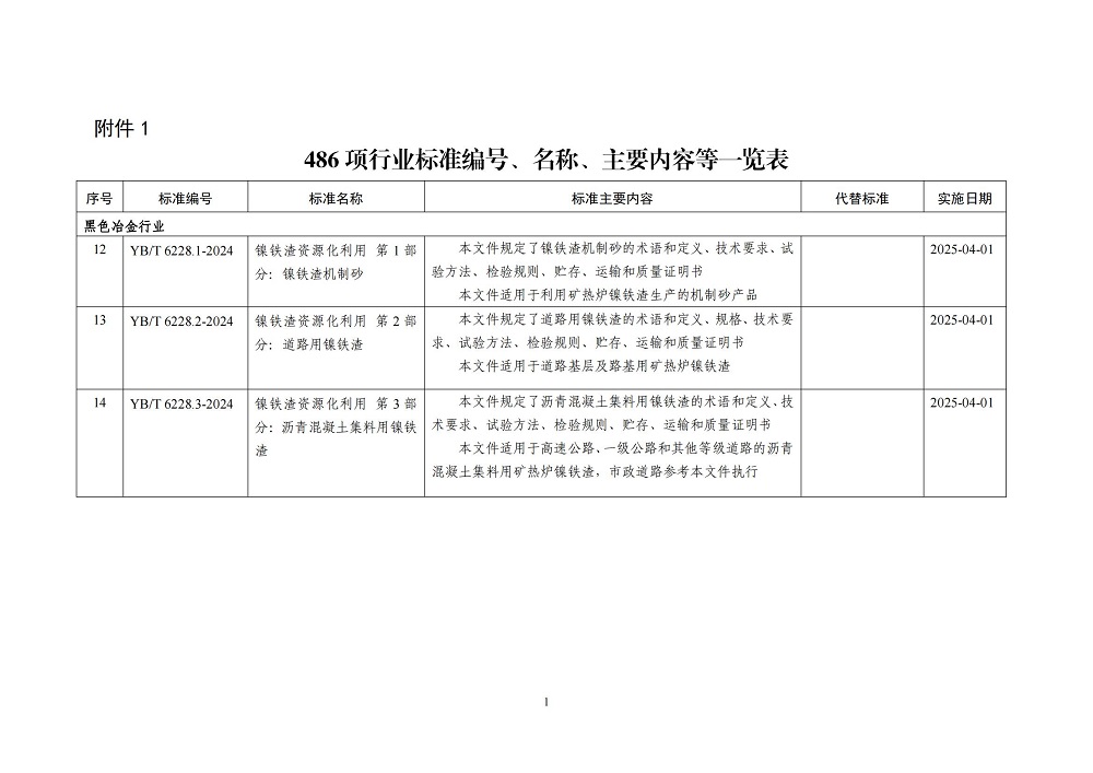 近日,工业和信息化部发布行业标准公告(2024年第39号),广东广青金属科技有限公司参与编制的《镍铁渣资源化利用 第1部分:镍铁渣机制砂》(YB/T 6228.1-2024)、《镍铁渣资源化利用 第2部分:道路用镍铁渣》(YB/T 6228.2-2024)、《镍铁渣资源化利用 第3部分:沥青混凝土集料用镍铁渣》(YB/T 6228.3-2024)等三项行业标准正式获批发布。